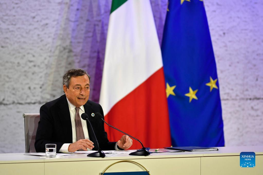 Italian Prime Minister Mario Draghi attends the closing press conference of the G20 Summit in Rome, Italy, on Oct. 31, 2021. The G20 Summit in Rome ended on Sunday with the adoption of a declaration reaffirming the crucial role of multilateralism and international cooperation in overcoming the global challenges arising from the COVID-19 pandemic. (Str/Xinhua)