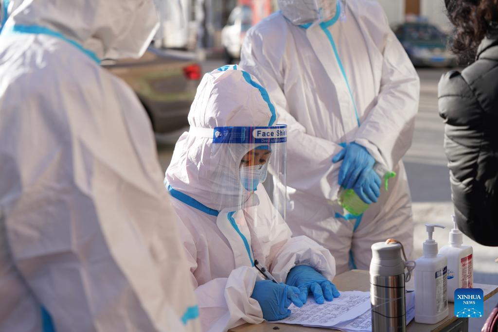 A medical worker registers information at a nucleic acid testing site in Heihe, northeast China's Heilongjiang Province, Oct. 31, 2021. As of 12:00 p.m. Saturday, Heihe in Northeast China's Heilongjiang Province reported 54 locally transmitted confirmed COVID-19 cases, according to local health authorities. Authorities in Heihe have started massive nucleic acid testing to contain the spread of infections, and taken measures to ensure the supply of daily necessities for residents. (Xinhua/Wang Song)