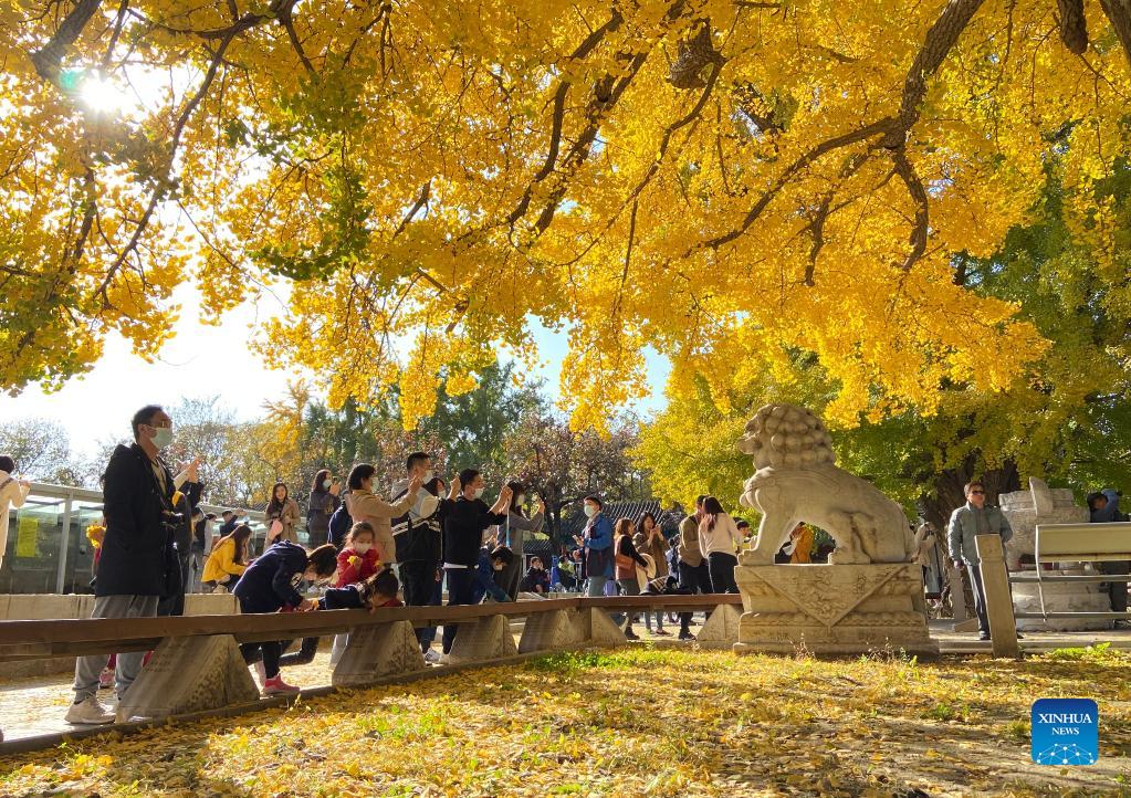 Photo taken with a cellphone on Oct. 31, 2021 shows people visiting Wuta (five-pagoda) Temple in Beijing, capital of China. (Xinhua/Wang Qingqin)