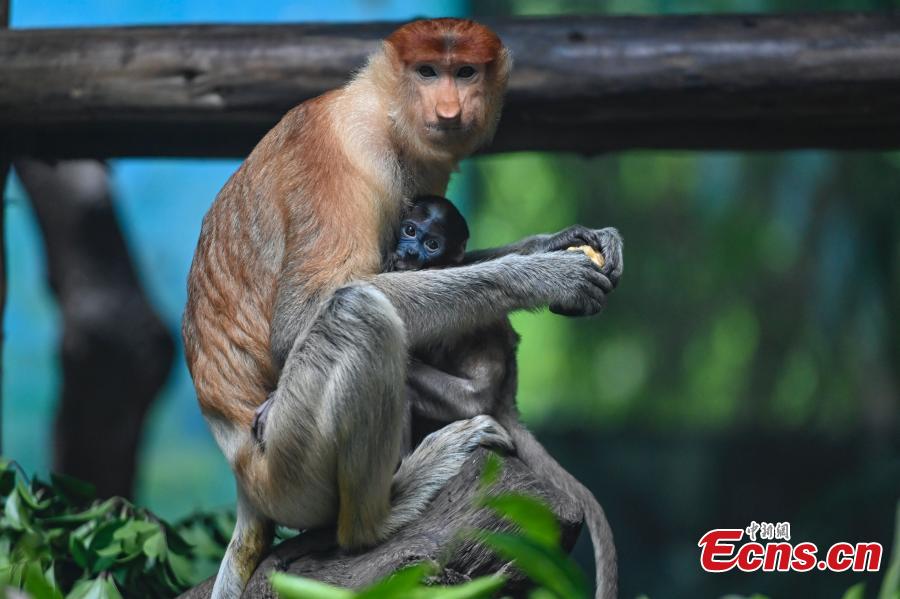 A baby proboscis monkey is held in the arm by its mother at Chimelong Safari Park in Guangzhou, south China's Guangdong Province, Oct. 27, 2021.(Photo: China News Service/Chen Jimin)