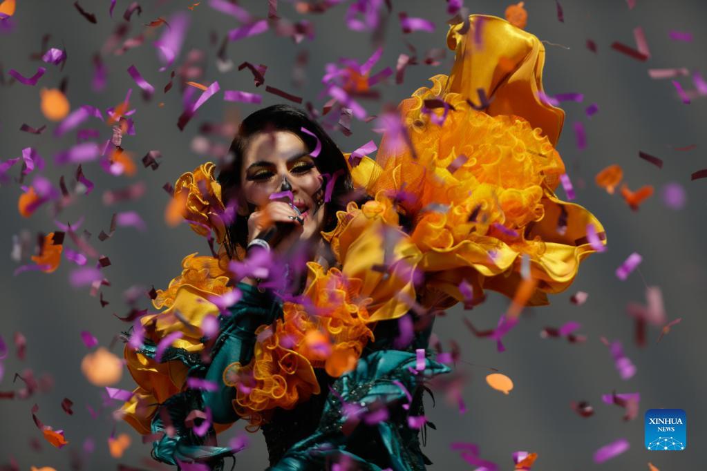 An artist in ghostly costume performs during the Day of the Dead Parade in downtown Mexico City, capital of Mexico, on Oct. 31, 2021. (Photo by Francisco Canedo/Xinhua)