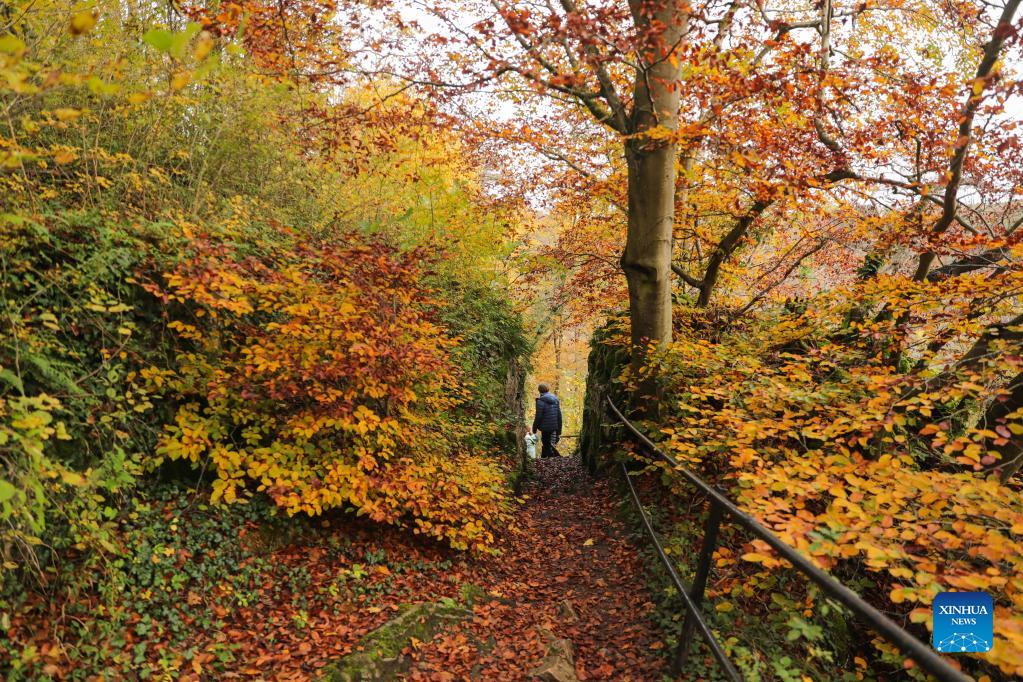 Tourists walk in the nature reserve of Park Furfooz in Dinant, Walloon Region, Belgium, Oct. 31, 2021. (Xinhua/Zheng Huansong)