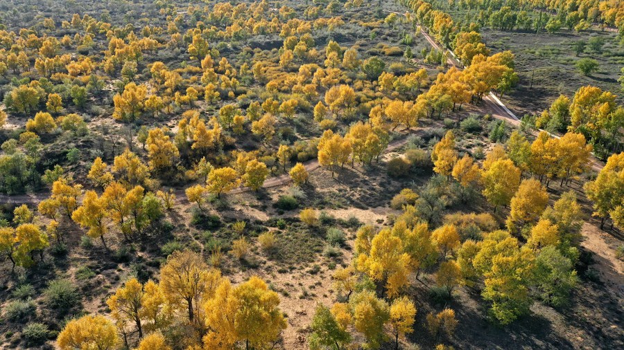 Aerial photo taken on Oct. 15, 2021 shows the autumn scenery at Haba Lake nature reserve of Yanchi County, northwest China's Ningxia Hui Autonomous Region. (Xinhua/Wang Peng)