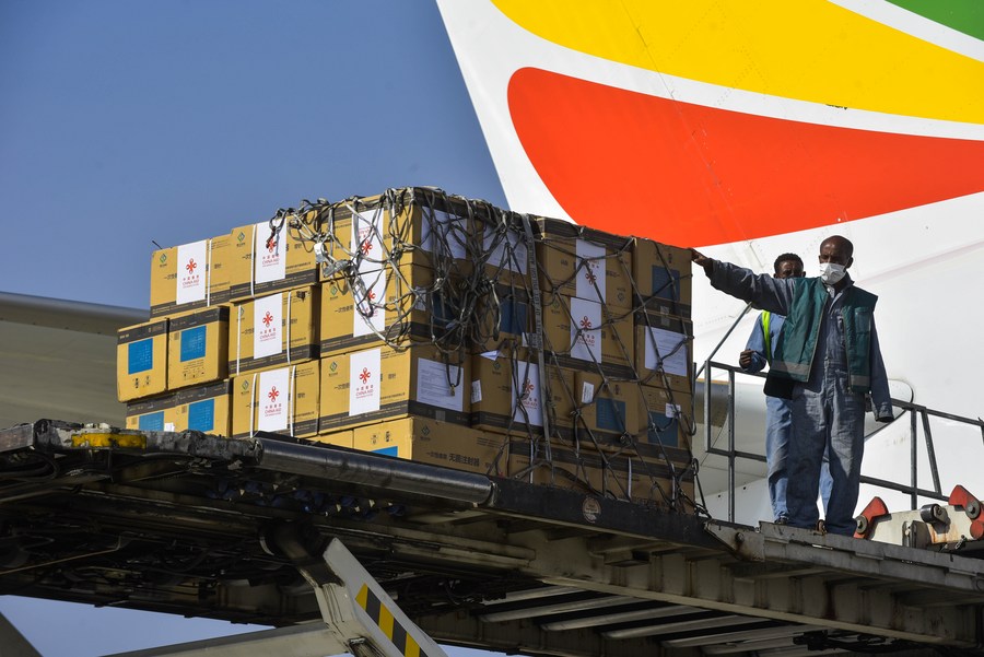 Workers unload China's Sinopharm COVID-19 vaccines, donated by the Chinese government to Ethiopia, at the Addis Ababa Bole International Airport in Addis Ababa, Ethiopia, on March 30, 2021. (Photo by Michael Tewelde/Xinhua)