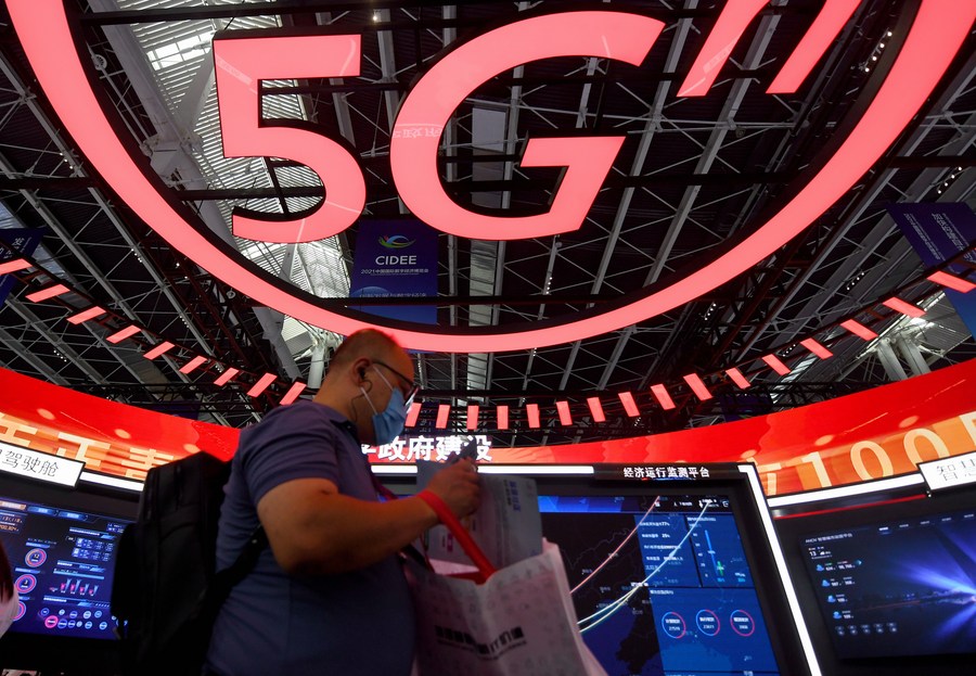 A man walks past the 5G exhibition area at the China International Digital Economy Expo 2021 in Shijiazhuang, north China's Hebei Province, Sept. 6, 2021.(Xinhua/Wang Xiao)