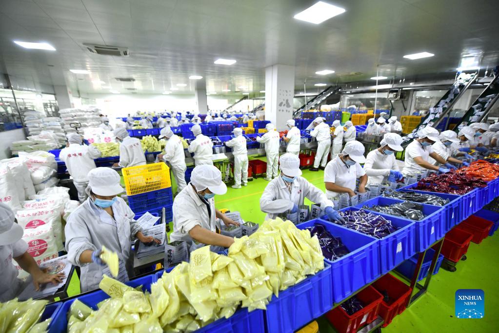 Workers pack Luosifen rice noodles at a food-processing company in Liuzhou, south China's Guangxi Zhuang Autonomous Region, Nov. 1, 2021. Luosifen companies in Liuzhou are working at full capacity to prepare enough stock for the upcoming "Double Eleven" online shopping festival. Liuzhou Luosifen, a soup dish dubbed by some people as "durian of soup" for its strong smell, features rice vermicelli soaked in a spicy broth flavored by river snails and topped with ingredients including pickled bamboo shoots, string beans, peanuts and tofu skin. (Xinhua/Huang Xiaobang)
