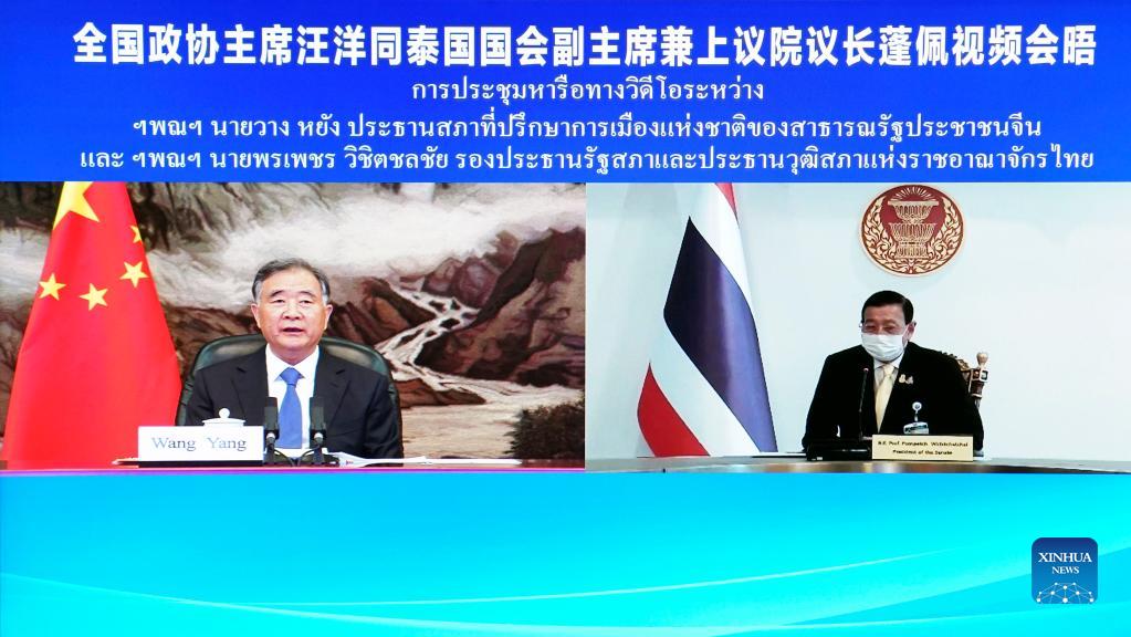 Wang Yang, chairman of the Chinese People's Political Consultative Conference National Committee, meets with Pornpetch Wichitcholchai, Thai deputy parliament president and Senate speaker, via video link in Beijing, capital of China, Nov. 1, 2021. (Xinhua/Yin Bogu)