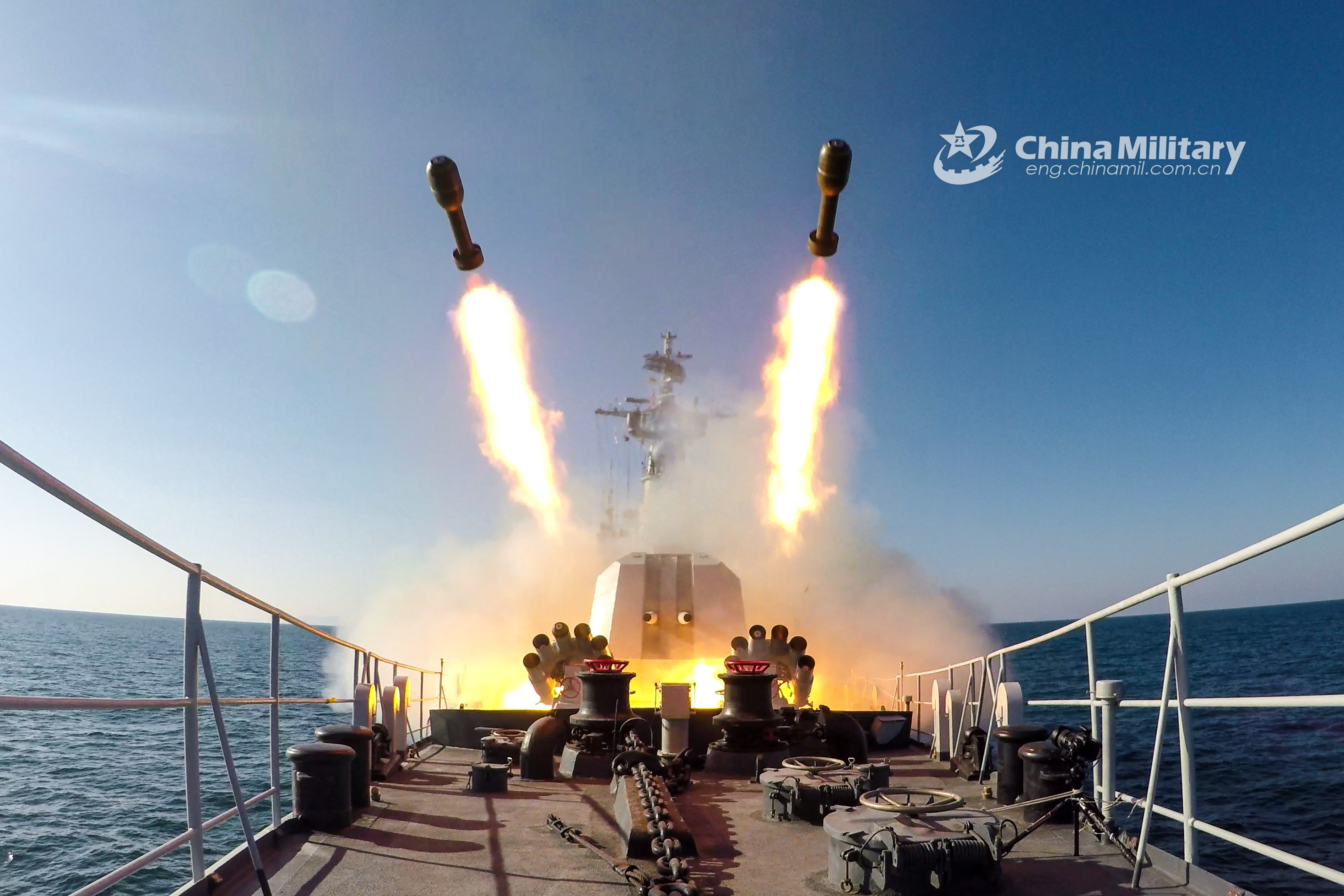 The guided-missile frigate Yichang (Hull 564) attached to a destroyer flotilla with the navy under the PLA Northern Theater Command fires rocket depth charges during a round-the-clock maritime drill in late October, 2021. (eng.chinamil.com.cn/Photo by Li Chenjie)