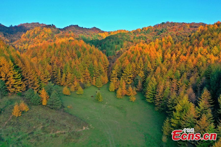 The Yuanyangchi (Mandarin Duck Pond) Forest Park of Zengjiashan is coated with red and golden leaves in Autumn in Guangyuan City, southwest China's Sichuan Province. (Photo: China News Service/Miao Zhiyong)