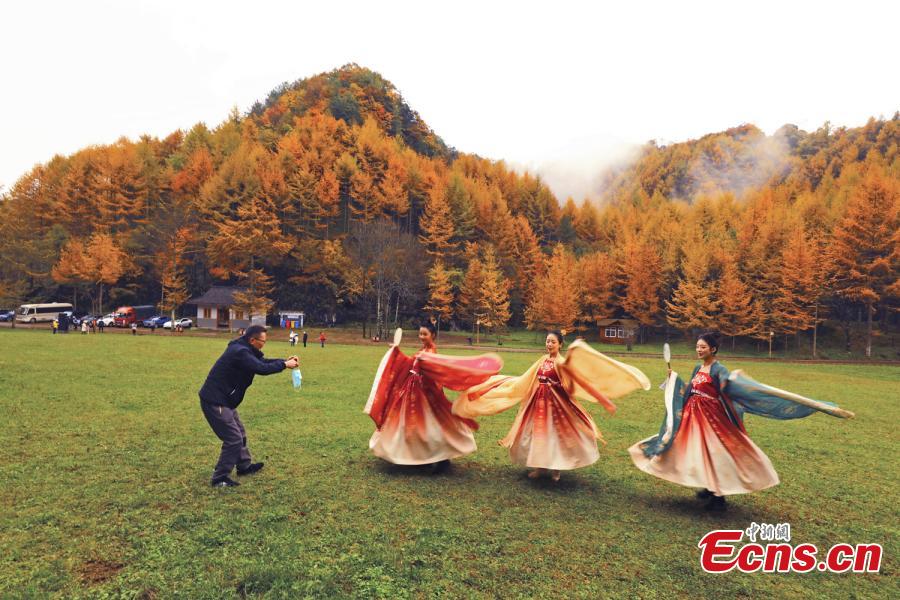 Tourists embrace the nature through dances in the golden forest at Zengjiashan, Guangyuan city, southwest China's Sichuan Province. (Photo: China News Service/Gao Zhinong)
