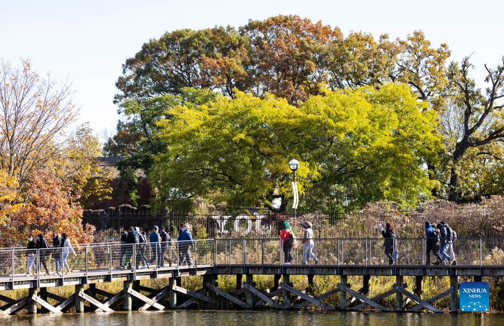 People walk at Lincoln Park Zoo surrounded by the fall colors in downtown Chicago, the United States, on Nov. 2, 2021. (Photo by Joel Lerner/Xinhua)