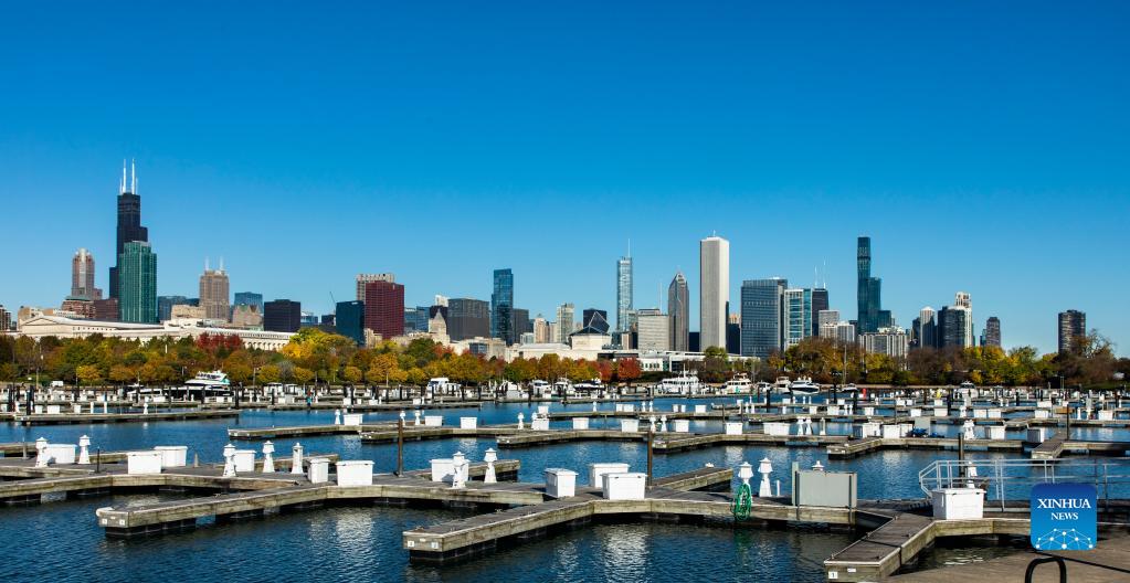 Photo taken on Nov. 2, 2021 shows buildings with trees in the fall colors in downtown Chicago, the United States. (Photo by Joel Lerner/Xinhua)