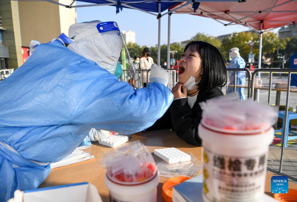 A medical worker takes a swab sample from a resident at a residential area in Jinfeng District of Yinchuan, northwest China's Ningxia Hui Autonomous Region, Nov. 2, 2021. A third round of nucleic acid test has been launched from 8 a.m. Tuesday in Yinchuan. As of Sunday, a total of 33 confirmed COVID-19 cases have been reported in Ningxia, with 21 cases in Yinchuan, the capital city. (Xinhua/Feng Kaihua)