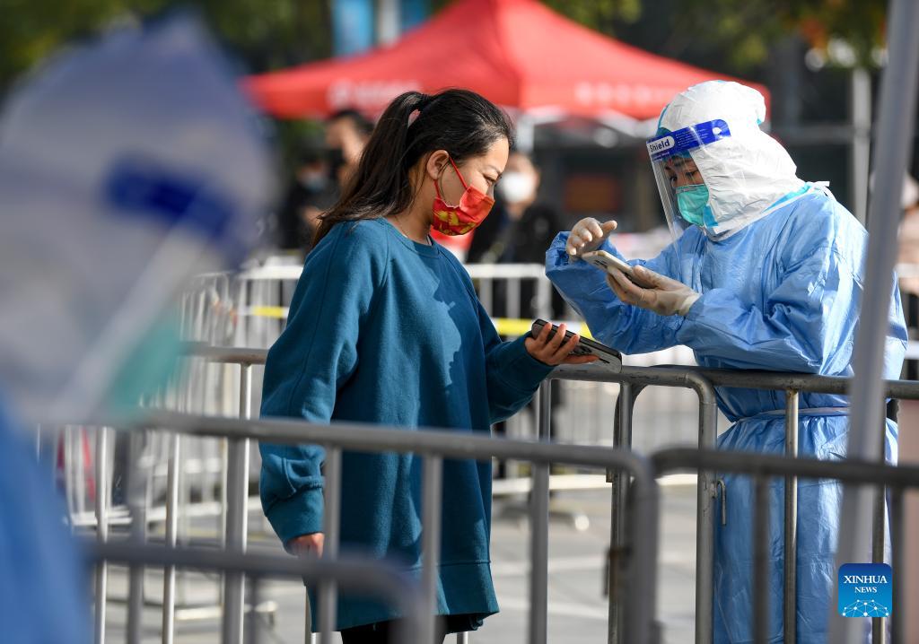 A medical worker scans a resident's health code to register information at a residential area in Jinfeng District of Yinchuan, northwest China's Ningxia Hui Autonomous Region, Nov. 2, 2021. A third round of nucleic acid test has been launched from 8 a.m. Tuesday in Yinchuan. As of Sunday, a total of 33 confirmed COVID-19 cases have been reported in Ningxia, with 21 cases in Yinchuan, the capital city. (Xinhua/Feng Kaihua)