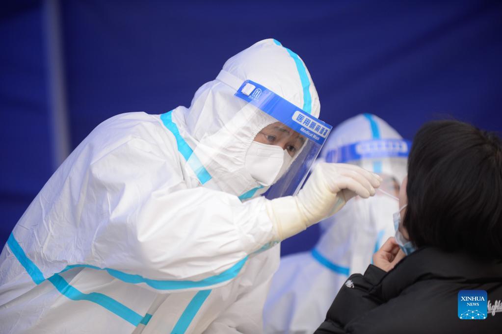 A medical worker collects a swab sample from a resident at a COVID-19 testing site in Chengxi District of Xining, northwest China's Qinghai Province, Nov. 2, 2021. Xining has set up 121 testing sites in Chengxi District for massive COVID-19 nucleic acid testing. (Xinhua/Zhang Manyi)