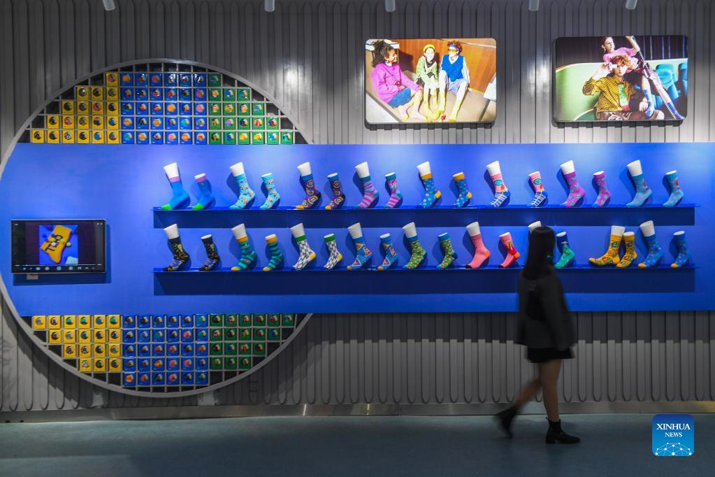 Various kinds of socks are displayed in a sock museum in Zhuji, east China's Zhejiang Province, Nov. 2, 2021. Local authorities in Zhuji, a major sock manufacturing base, have stepped up diversified financial support to develop sock industry and promote industrial upgrading. (Xinhua/Xu Yu)