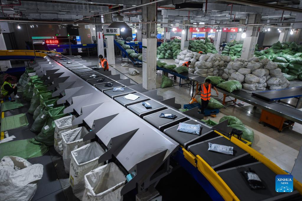 Staff members process packages, most of which are socks products, at a logistics center in Zhuji, east China's Zhejiang Province, Nov. 2, 2021. Local authorities in Zhuji, a major sock manufacturing base, have stepped up diversified financial support to develop sock industry and promote industrial upgrading. (Xinhua/Xu Yu)