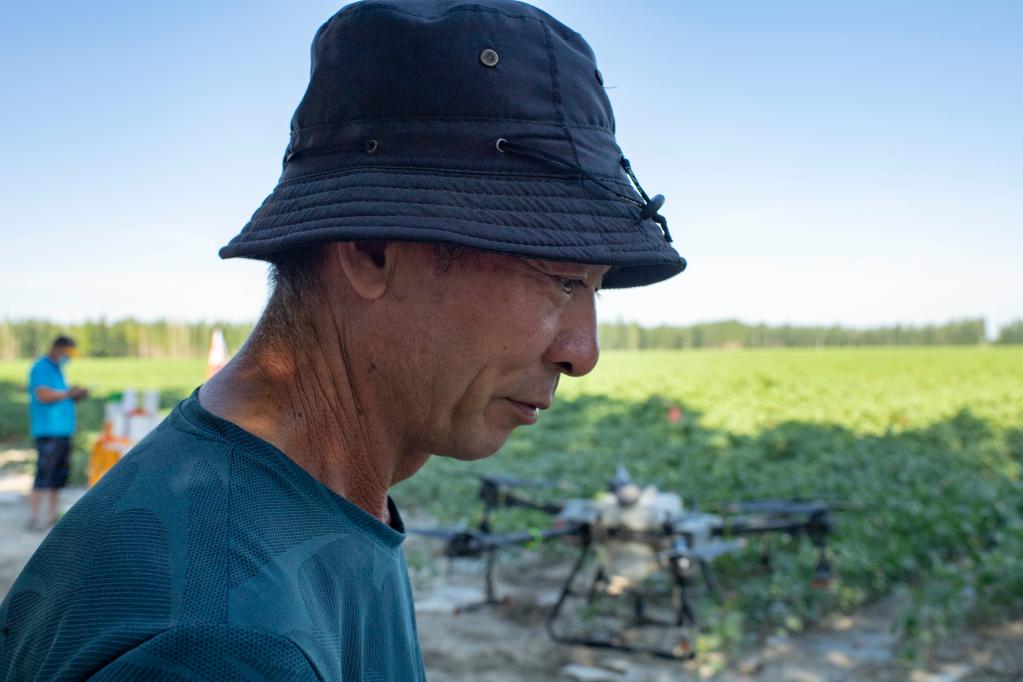 An unmanned aerial vehicle (UAV) is seen in Lu Gaolin's cotton fields in Shawan City, northwest China's Xinjiang Uygur Autonomous Region, July 15, 2021. The use of UAVs makes farming easier and improves efficiency. Lu Gaolin, a cotton farmer, is 56 years old and lives in Shawan City of Xinjiang Uygur Autonomous Region. The cotton harvest season in Xinjiang, China's largest cotton-producing region, will last until mid-November this year, with the output expected to reach 5.2 million tonnes. The region has contributed nearly 90 percent of China's cotton production capacity and about 20 percent of the global cotton production. In four days, Lu Gaolin completely finished harvesting his 64-hectare cotton field thanks to a gigantic green machine. The cotton picker is way more efficient than manual labor. "It used to take seven or eight workers over two months to complete the job of manually picking cotton," he said. Furthermore, new methods such as machine seeding and drone spraying have greatly improved farm work efficiency and quality. After this picking season, Lu and his son Dewen have bigger plans for the coming year. They intend to purchase a new cotton picker worth about 940,000 U.S. dollars together with other cotton farmers in order to increase their income. (Xinhua/Hu Huhu)