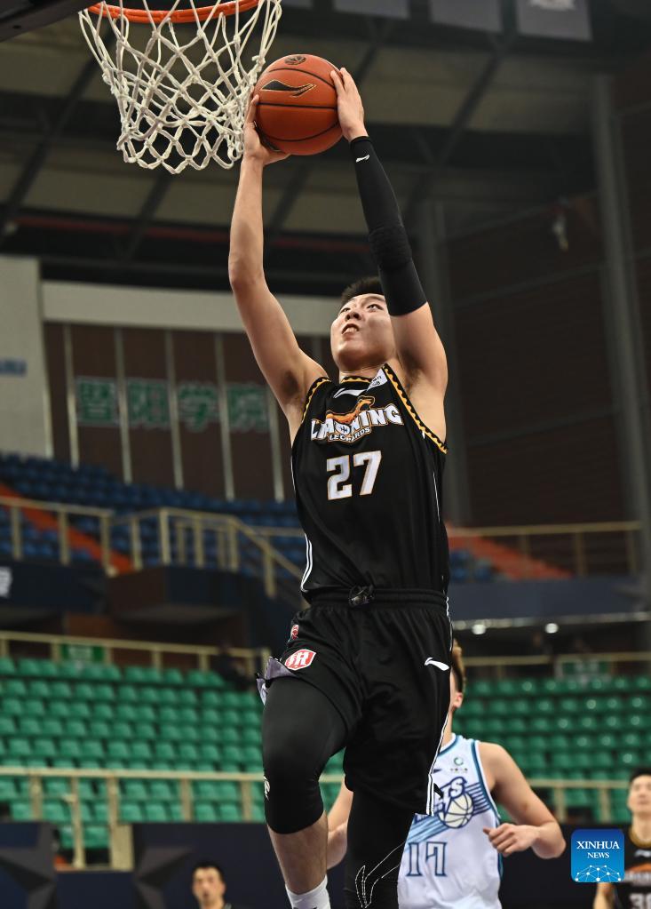 Yu Zechen of Liaoning Flying Leopards goes for the basket during the 8th round match between Liaoning Flying Leopards and Ningbo Rockets at the 2021-2022 season of the Chinese Basketball Association (CBA) league in Zhuji, east China's Zhejiang Province, Nov. 2, 2021. (Xinhua/Chen Xinbo)