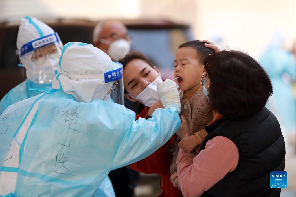 A medical worker takes a swab sample from a child for COVID-19 nucleic acid test at a residential area in Shenze County of Shijiazhuang, north China's Hebei Province, Nov. 2, 2021. Shijiazhuang has activated an emergency response mechanism, with temporary prevention and control measures put in place in regions such as Shenze County and Jinzhou City. Two locally transmitted COVID-19 cases were reported in Shijiazhuang between 4 p.m. Monday and 11 a.m. Tuesday. (Photo by Zhai Haijing/Xinhua)