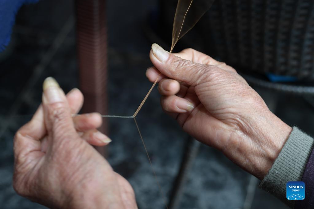 An embroiderer of the Shui ethnic group makes sewing threads for the traditional horse tail embroidery with horse tail fibers and silk yarns in Xuehuahu relocation community of Zhonghe Township in Sandu Shui Autonomous County, southwest China's Guizhou Province, Nov. 2, 2021. Women in the community were trained as embroiderers of traditional horse tail embroidery to increase their income. (Xinhua/Yang Ying)