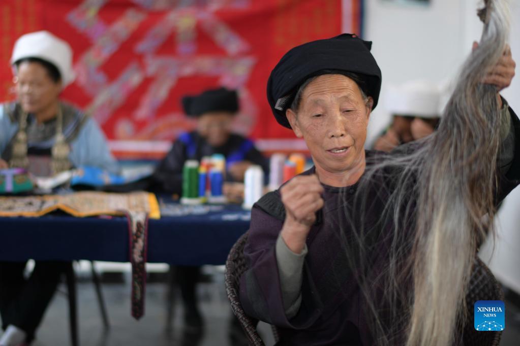 An embroiderer of the Shui ethnic group makes sewing threads for the traditional horse tail embroidery with horse tail fibers and silk yarns in Xuehuahu relocation community of Zhonghe Township in Sandu Shui Autonomous County, southwest China's Guizhou Province, Nov. 2, 2021. Women in the community were trained as embroiderers of traditional horse tail embroidery to increase their income. (Xinhua/Yang Ying)
