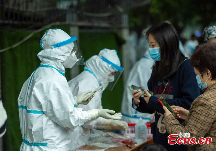 Medical staffs check and confirm basic information of residents taking the nucleic acid test in Chengdu, southwest China's Sichuan Province, Nov.2, 2021. (Photo: China News Service/Liu Zhongjun)
