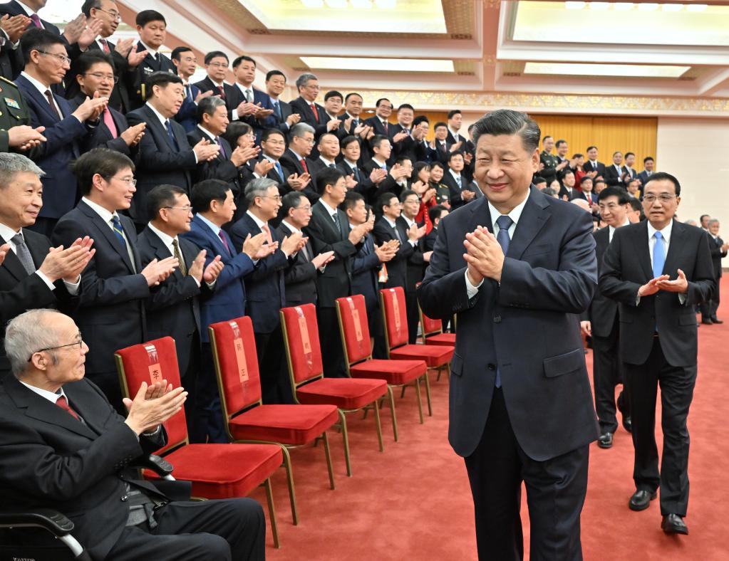 Chinese President Xi Jinping, also general secretary of the Communist Party of China (CPC) Central Committee and chairman of the Central Military Commission, and other Party and state leaders, including Li Keqiang, Wang Huning and Han Zheng, meet with representatives of the winners before an annual ceremony to honor distinguished scientists, engineers and research achievements at the Great Hall of the People in Beijing, capital of China, Nov. 3, 2021. (Xinhua/Li Xueren)