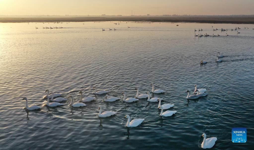 Aerial photo taken on Nov. 3, 2021 shows a flock of swans swimming on the lake of the Hongjiannao Wetland Reserve in Shenmu, northwest China's Shaanxi Province. Flocks of wintering wild geese and swans have arrived at the Hongjiannao Wetland Reserve on their route of migration. (Xinhua/Tao Ming)