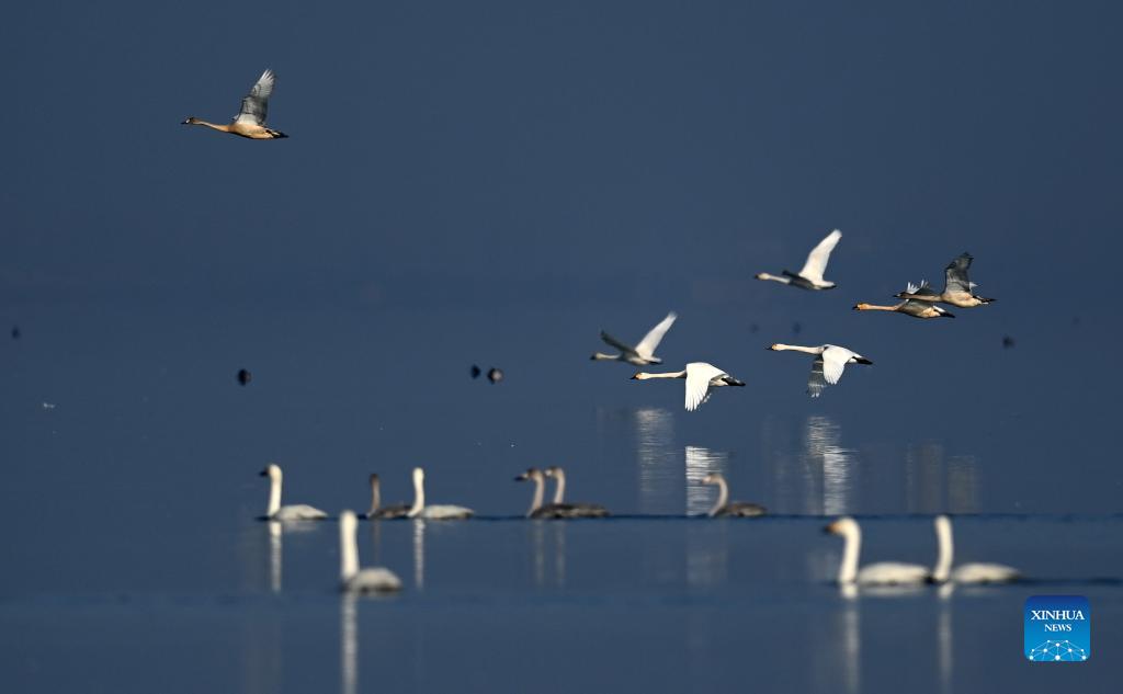Wild geese and swans are seen at the Hongjiannao Wetland Reserve in Shenmu, northwest China's Shaanxi Province, Nov. 3, 2021. Flocks of wintering wild geese and swans have arrived at the Hongjiannao Wetland Reserve on their route of migration. (Xinhua/Tao Ming)