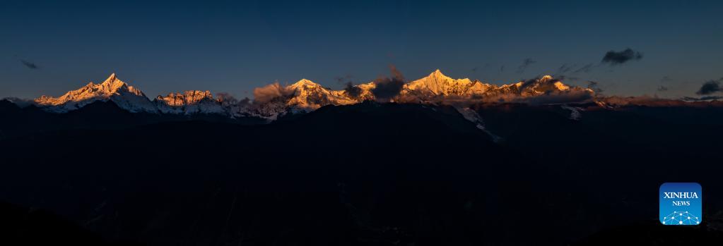 Aerial photo taken on Oct. 28, 2021 shows the sunrise over the Meili Snow Mountains in Deqen Tibetan Autonomous Prefecture, southwest China's Yunnan Province. The Mingyong Glacier, located on the east slope of the Meili Snow Mountains, is one of the world's few low-latitude glaciers. (Xinhua/Jiang Wenyao)