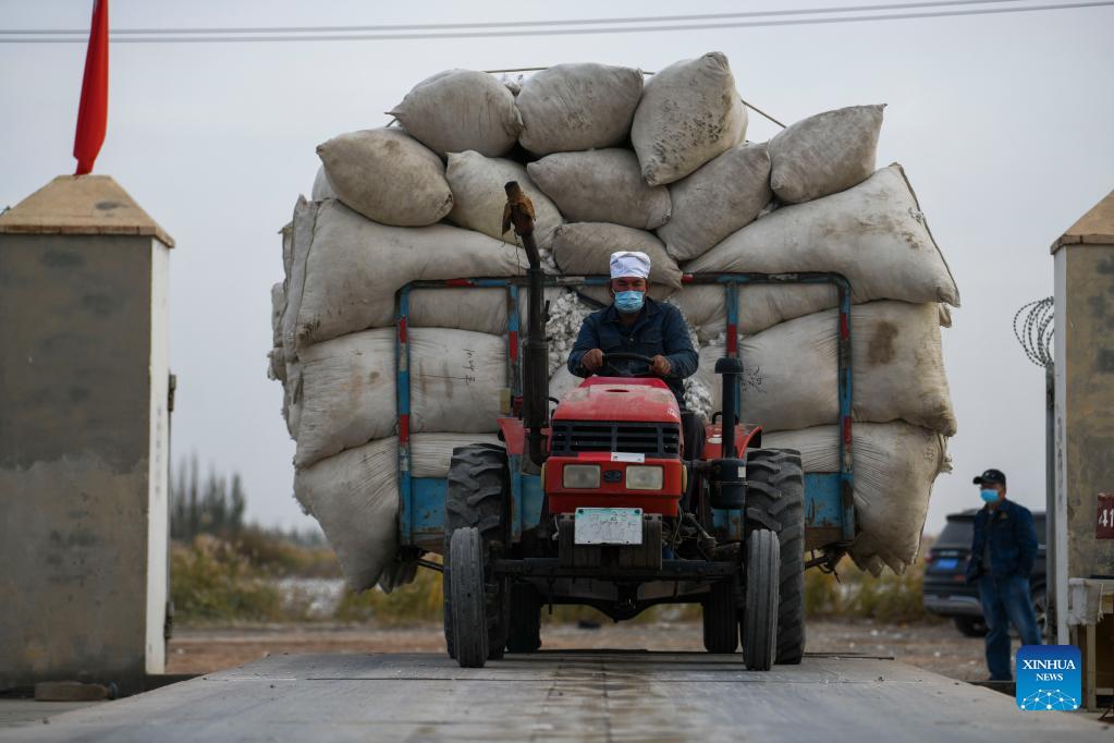 Erkin Rehim drives a tractor to sell his cotton to a factory in Yuli County, northwest China's Xinjiang Uygur Autonomous Region, Oct. 22, 2021. Erkin Rehimc began growing cotton in 2004 and has benefited from agricultural mechanization since 2017. The cotton farmer, 49, uses cotton pickers to harvest his 550 mu (about 90.6 acres) of cotton fields in 24 hours. (Xinhua/Zhao Ge)