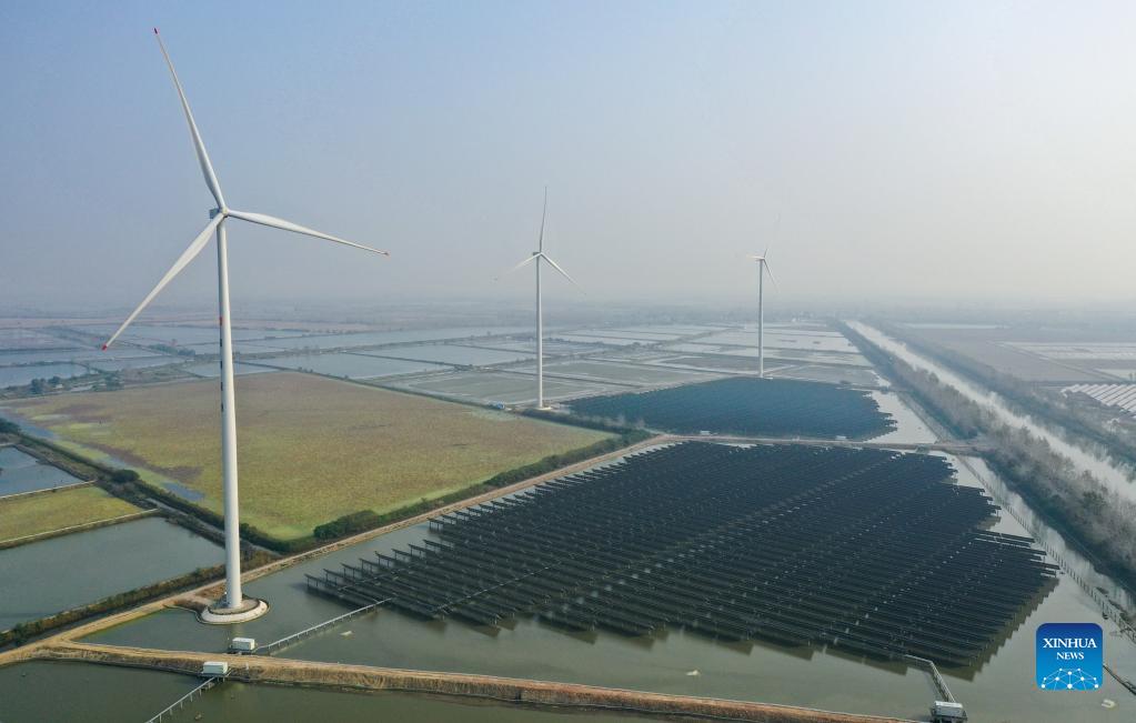 Aerial photo taken on Nov. 3, 2021 shows a photovoltaic and wind power generation project installed above the fishery waters in Sheyanghu Township of Baoying County of Yangzhou, east China's Jiangsu Province. Baoying County of Yangzhou has been boosting green development by promoting solar and wind energy in recent years. The county's annual power generation from clean energy now reaches 2.1 billion kWh, accounting for 84 percent of the county's annual electricity consumption, equivalent to reducing coal consumption by 840,000 tonnes. (Xinhua/Li Bo)