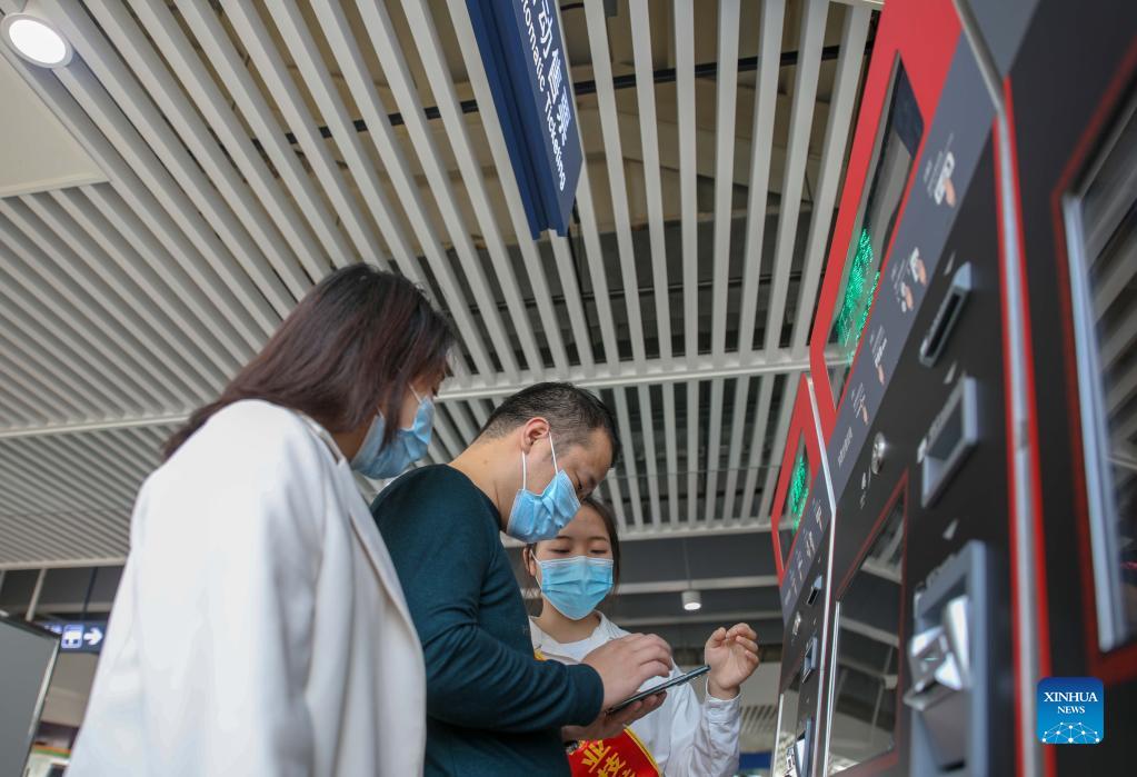 Citizens buy tickets to board the train running on the monorail line 1 in Wuhu City, east China's Anhui Province, Nov. 3, 2021. The city of Wuhu officially unveiled its first monorail line on Wednesday amid efforts to build a green transportation system in the city. The monorail line 1 operates in a north-south direction covering a total distance of 30.5 kilometers with 25 elevated stations. Trains plying on the line can travel at a speed of up to 80 kilometers per hour. (Xinhua/Cao Li)
