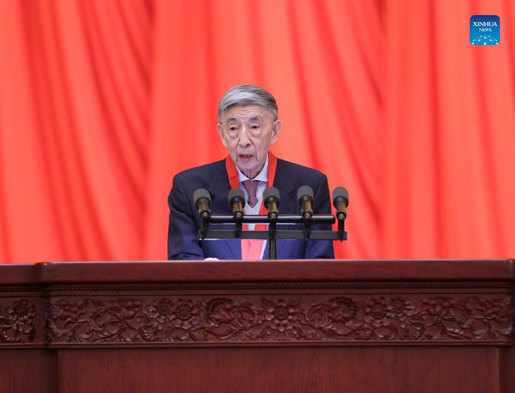 Nuclear expert Wang Dazhong, winner of China's top science award, speaks at an annual ceremony honoring distinguished scientists, engineers and research achievements in Beijing, capital of China, Nov. 3, 2021. (Xinhua/Pang Xinglei)