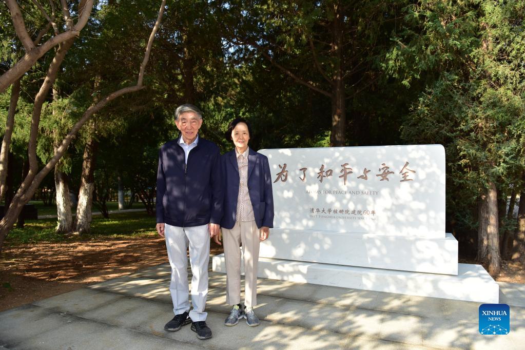 Wang Dazhong and his wife pose for a photo at Tsinghua University in Beijing, capital of China, Sept. 14, 2020. Wang Dazhong, winner of China's top science award, was born in 1935, and is an internationally reputed nuclear scientist. A Chinese Academy of Sciences academician and former president of Tsinghua University, he has dedicated himself to the research and development of advanced nuclear energy technologies. One of his many internationally recognized achievements was the successful development of the first 10-mW modular high-temperature air-cooling nuclear reactor, which was put to commercial operation in 2003. (Tsinghua University/Handout via Xinhua)