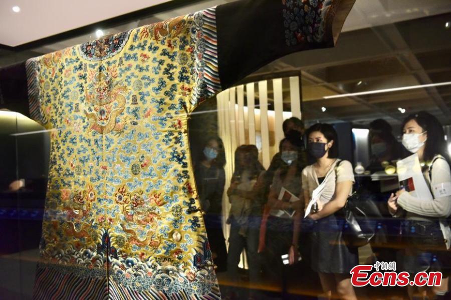 An imperial yellow clothing with dragon ornamentation is displayed at an exhibition in Hong Kong, focusing on the splendor of traditional colors on Chinese cultural relics, Nov.3, 2021. (Photo: China News Service/Li Zhihua)