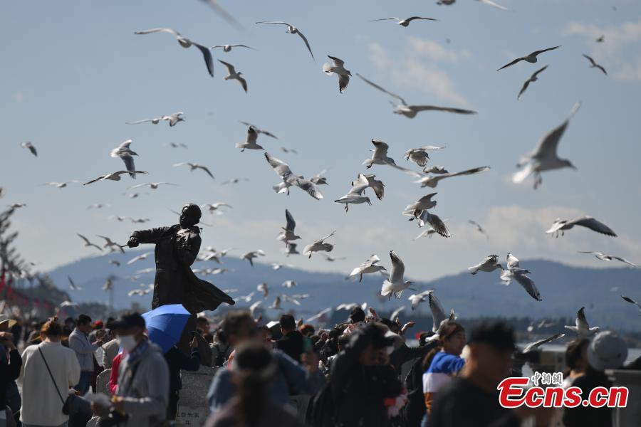 Tourists and citizens watch and feed the red-beaked gulls at Haigeng Dam in Kunming, southwest China's Yunnan Province, Nov.3, 2021. (Photo: China News Service/Liu Ranyang)