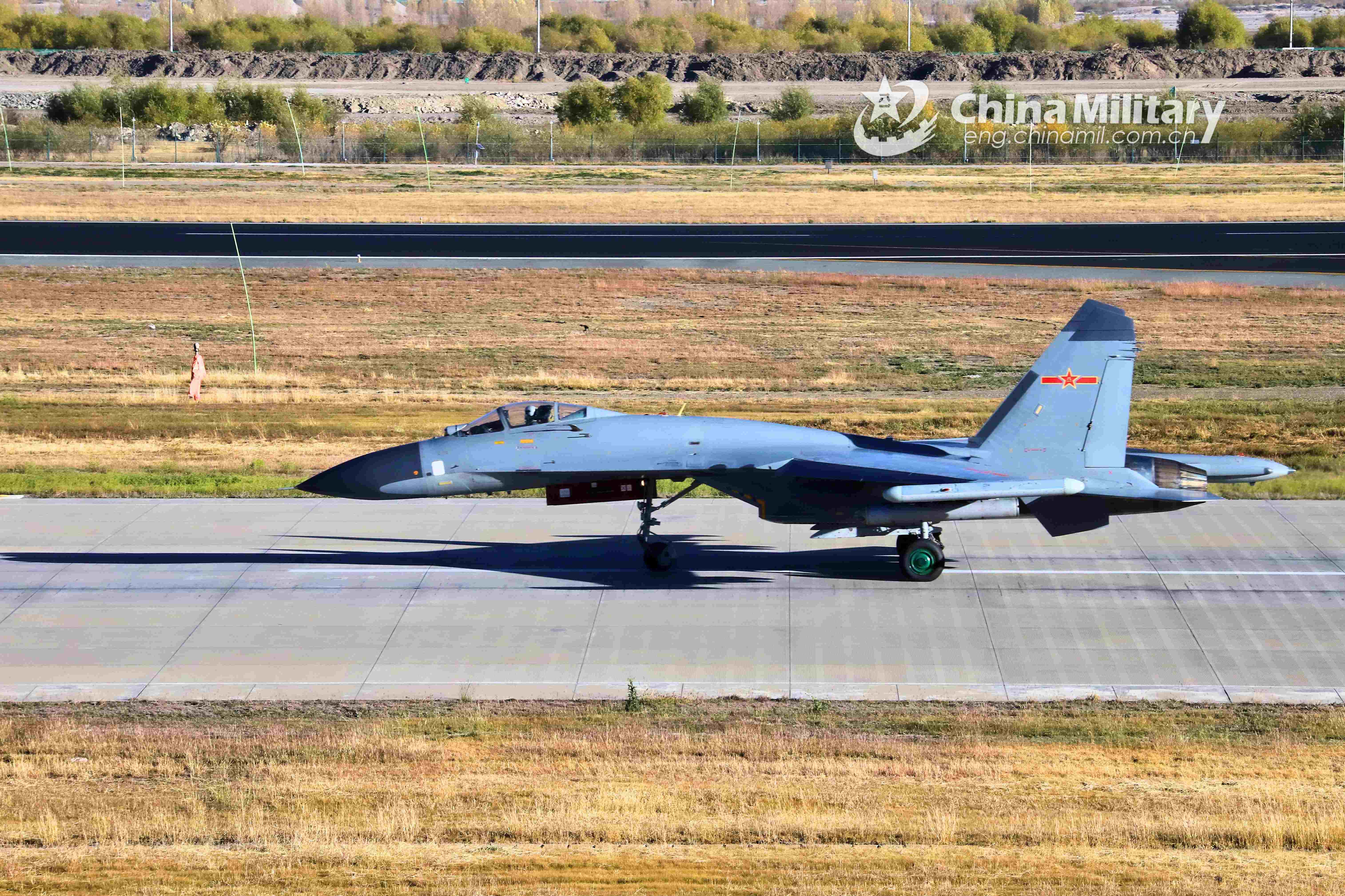 A fighter jet attached to an aviation brigade of the air force under the PLA Western Theater Command taxies on the runway prior to its taking-off for flight training on October 26, 2021. (eng.chinamil.com.cn/Photo by Wen Rui)