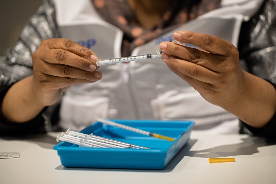 A staff worker prepares COVID-19 vaccine at the Porte de Versailles Exhibition Center in Paris, France, May 28, 2021. (Photo by Aurelien Morissard/Xinhua)