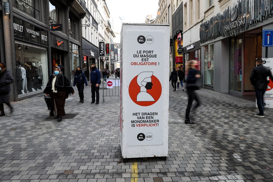 People walk past a sign reminding people to wear face masks on a shopping street in Brussels, Belgium, Jan. 22, 2021. (Xinhua/Zhang Cheng)