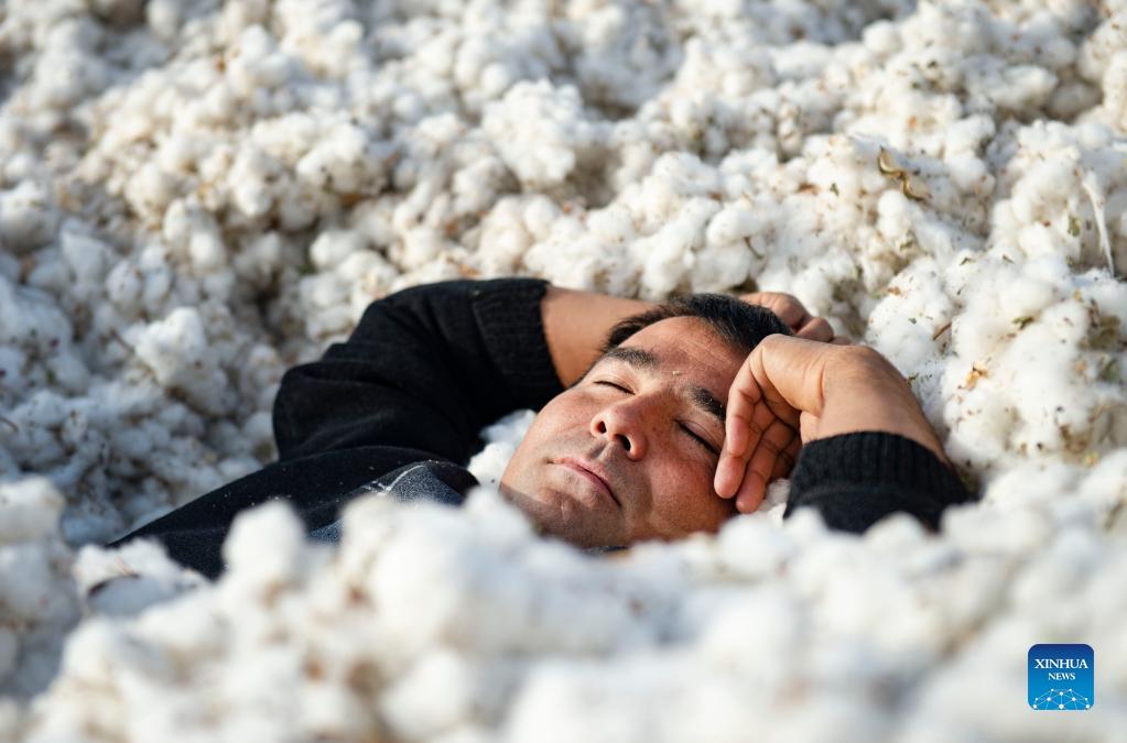 Amar Aziz takes a nap in a cotton pile in Toyboldi Town of Xayar County, Aksu Prefecture, northwest China's Xinjiang Uygur Autonomous Region, Oct. 26, 2021. Amar Aziz lives in Xayar County, Aksu Prefecture, which is an important cotton-producing area in Xinjiang. His family has been planting cotton for more than 20 years. In the early years, cotton planting and picking mainly depended on manpower. In the cotton picking season, with more than a dozen pickers hired, it would take them three months to finish the work in 300 mu (20 hectares) of cotton fields. Nowadays, with the popularization of mechanization, the efficiency and income have been significantly improved. In 2020, Amar Aziz bought a cotton picker with a loan, and bought another one in partnership with friends. "Now most people will choose mechanical cotton picking," Amar Aziz said. Appointment for his cotton picking service has been scheduled for two weeks. In order to improve harvesting efficiency, he hired four drivers for each machine. Excluding the costs of fuel, maintenance and staff salaries, Amar Aziz estimates that his two cotton pickers can harvest about 8,000 mu (533 hectares) of cotton and earn him 800,000 yuan (125,040 dollars) this year. (Xinhua/Ma Kai)