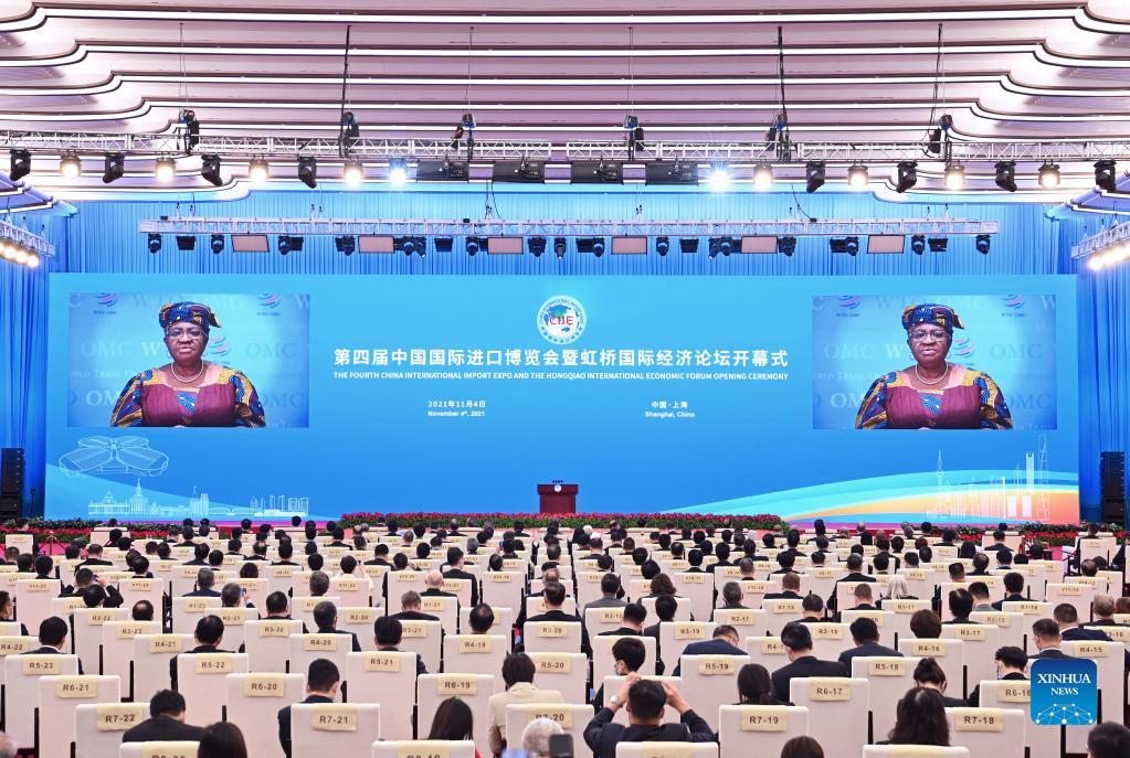 Ngozi Okonjo-Iweala, director general of the World Trade Organisation (WTO), speaks via video at the opening ceremony of the fourth China International Import Expo held in east China's Shanghai, Nov. 4, 2021. (Xinhua/Li Xiang)