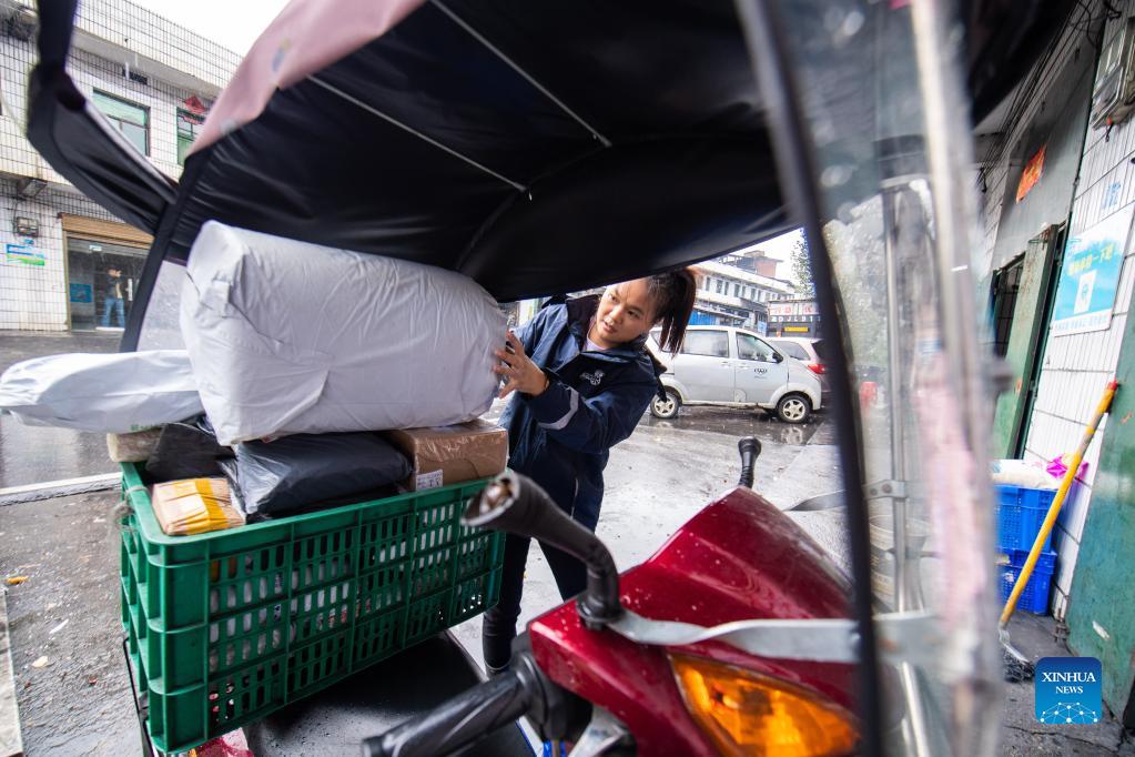 Hu Xia loads packages for delivery in a rural delivery station in Huangshi Town in Leiyang, central China's Hunan Province, Nov. 3, 2021. Hu Xia is a post-90s deliverywoman providing delivery service for four villages in Huangshi Town. Over the past seven years, the number of local rural delivery orders has increased from less than 10 per day to more than 200 now. In addition to delivering packages, Hu also helps villagers sell bamboo shoots, eggs and other agricultural specialties through online store. Her delivery station has become one of the most lively places in village. In the January-August period, the delivery industry handled over 28 billion parcels in rural areas, a jump of more than 30 percent from a year earlier, according to the State Post Bureau. (Xinhua/Chen Sihan)