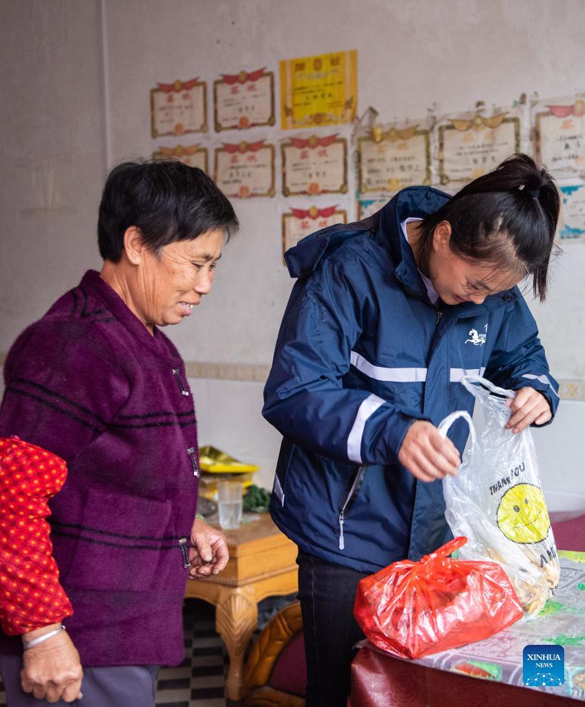 Hu Xia (R) collects packages in Jinping Village of Huangshi Town in Leiyang, central China's Hunan Province, Nov. 3, 2021. Hu Xia is a post-90s deliverywoman providing delivery service for four villages in Huangshi Town. Over the past seven years, the number of local rural delivery orders has increased from less than 10 per day to more than 200 now. In addition to delivering packages, Hu also helps villagers sell bamboo shoots, eggs and other agricultural specialties through online store. Her delivery station has become one of the most lively places in village. In the January-August period, the delivery industry handled over 28 billion parcels in rural areas, a jump of more than 30 percent from a year earlier, according to the State Post Bureau. (Xinhua/Chen Sihan)