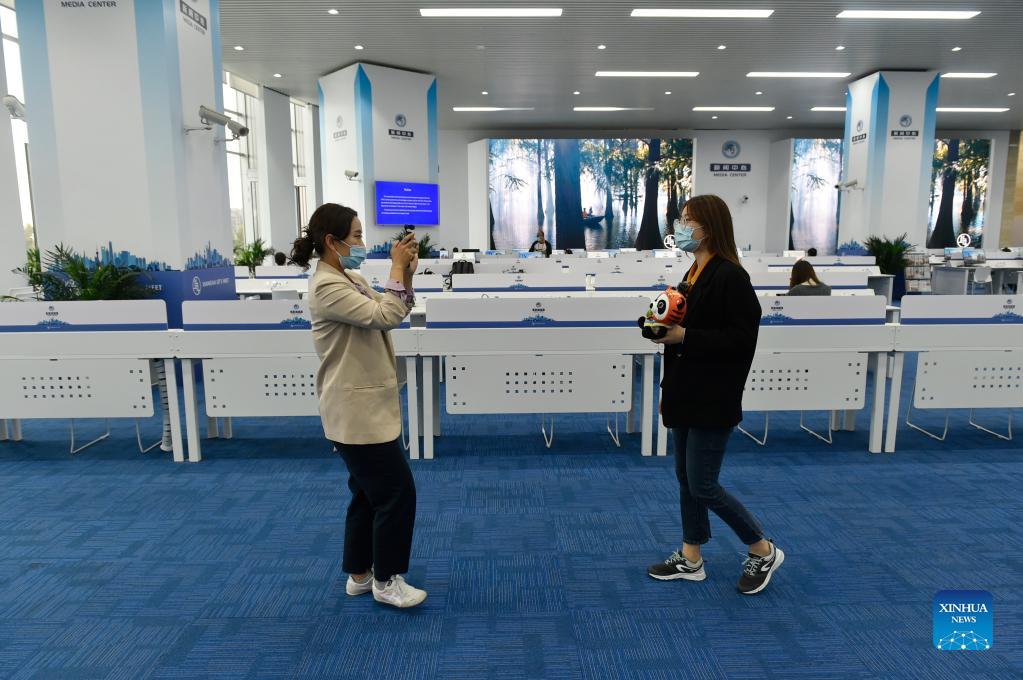 Reporters work at the media center of the 4th China International Import Expo (CIIE) at the National Exhibition and Convention Center (Shanghai) in Shanghai, east China, Nov. 4, 2021. The 4th China International Import Expo (CIIE) is scheduled for Shanghai from Nov. 5 to 10. (Xinhua/Lu Peng)