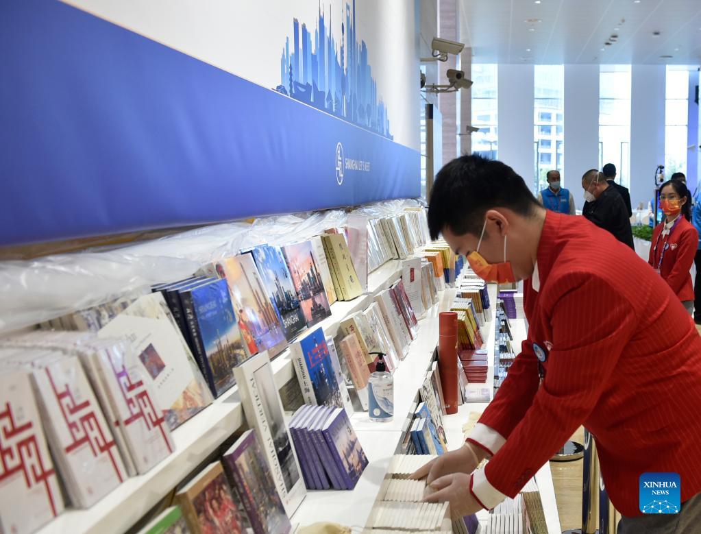 A volunteer works at the media center of the 4th China International Import Expo (CIIE) at the National Exhibition and Convention Center (Shanghai) in Shanghai, east China, Nov. 4, 2021. The 4th China International Import Expo (CIIE) is scheduled for Shanghai from Nov. 5 to 10. (Xinhua/Lu Peng)