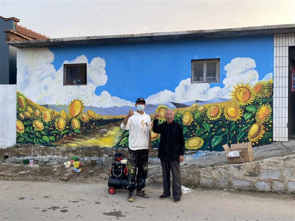 Shang Qinjie (left) poses for a photo with Li Junchen, a resident in Xitouying village, Chengde city, north China’s Hebei province, in front of a wall painting of sunflowers he has made. (Photo/Shanghai Observer)