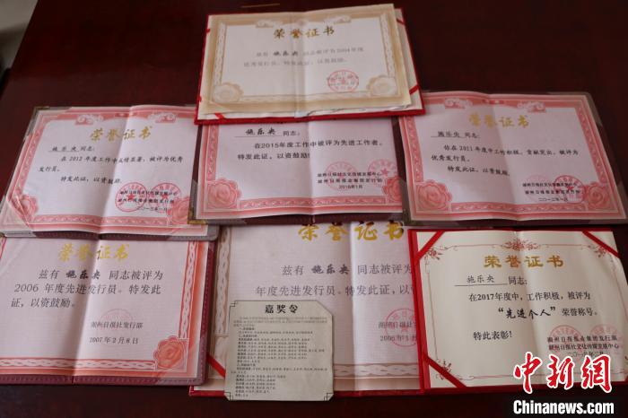Photo shows the certificates of honor Shi Leyang and his wife Ye Ecai were awarded. (Chinanews.com/He Weiwei)