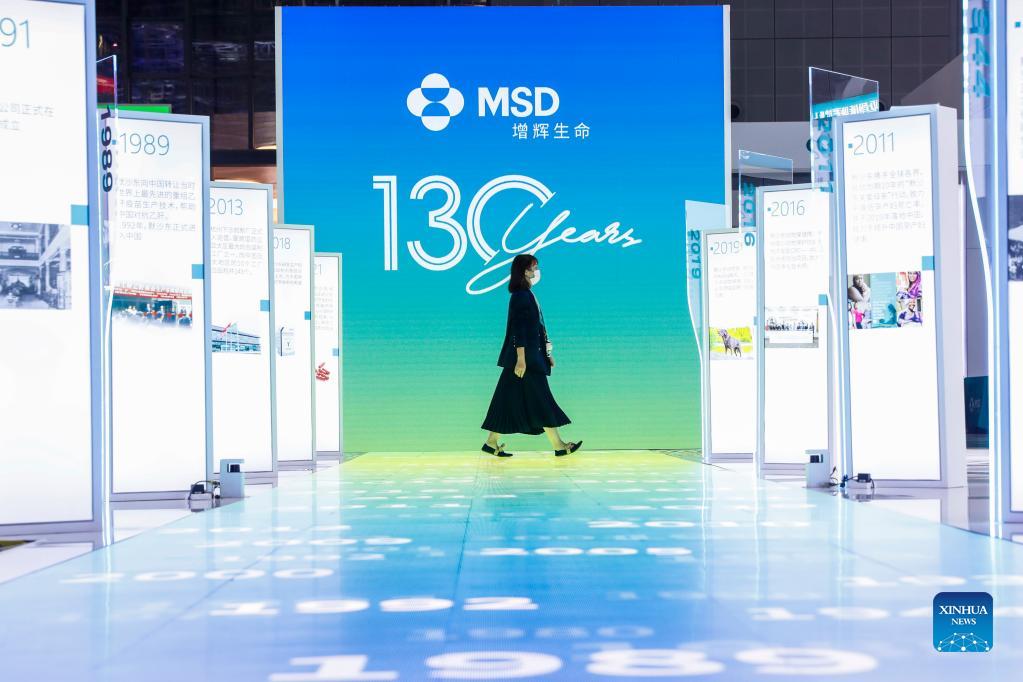 A visitor walks past the booth of pharmaceutical giant MSD at the Medical Equipment and Healthcare Products Exhibition Area of the 4th China International Import Expo (CIIE) in east China's Shanghai, Nov. 7, 2021. (Xinhua/Zhang Yuwei)